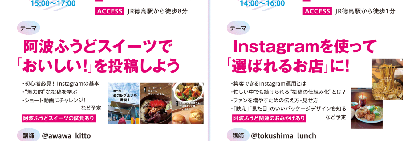 「徳島の食」を応援し、その魅力をSNSなどの手段を用いて発信する阿波ふうどスペシャリストを対象に、食のインフルエンサーから魅力的な写真撮影や集客につなげるためのメソッドを学び、自身のアカウントの発信力を高めることを目的と … 続きを読む 阿波ふうどスペシャリスト「Instagram投稿と運用を学ぶセミナー」を開催しました!