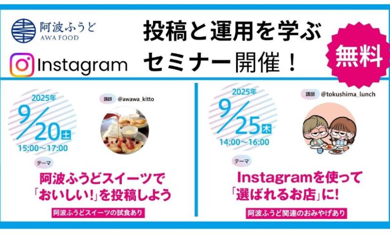 9月20日(土)、25日(木)に、阿波ふうどスペシャリスト限定の「Instagram 投稿と運用を学ぶセミナー」を徳島駅前で開催します。